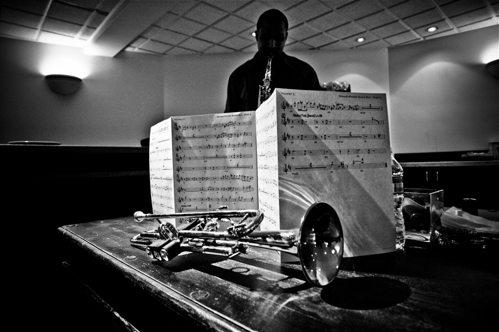 Seemingly unconscious of my presence there is a moment between silence and mid-note that my lens captures Randys silhouette. He rehearses, then pauses to contemplate a melodic and rhythmic pattern. He continues to rehearse filling the room with waves of invisible sentiment. To the ear its blues, cool, romantic and yet a feeling of expressing pensive sadness. The rehearsal room turns blue.