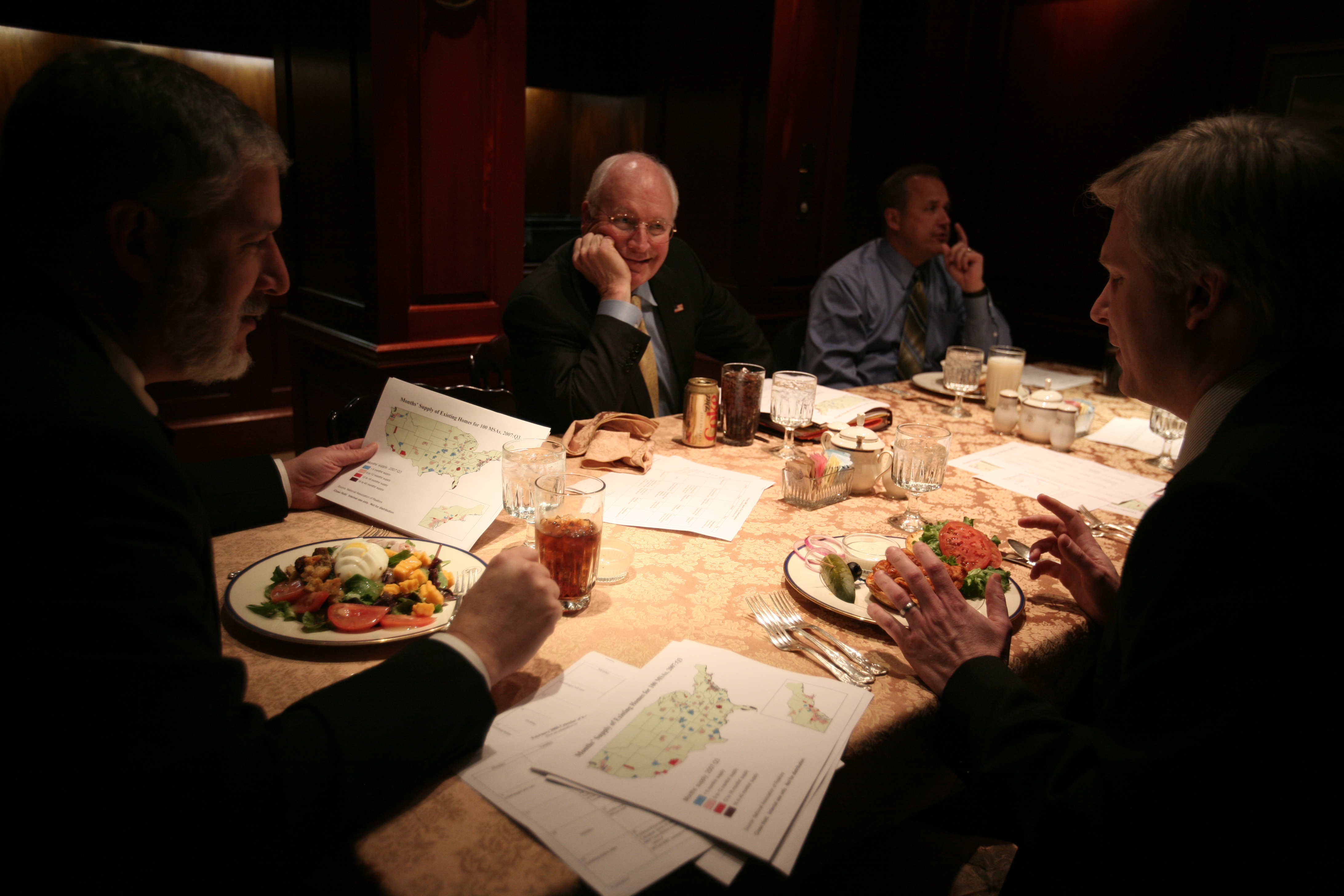Vice President Dick Cheney was grinding his teeth, his head cocked to one side, as if to take aim at his plate of cantaloupe and assorted breakfast goodies. He bore an irritating smirk of satisfaction as he chomped down on the ripe pink flesh, all the while scanning the hotel’s elegant breakfast room. The room was incredibly quiet with just the occasional sound of silver spoons stirring within porcelain cups. At the entrance of the breakfast room, and at each exit, were dozens of dark-suited agents, their die-cast pins sat proudly on their lapels. Each agent had an earpiece with a clear acoustic tube that dropped down underneath their jacket collar.