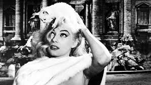 This is the real story of my affair with Anita Ekberg. In 2012, I had written a very short paragraph of my first visit to the Trevi Fountain in Rome, Italy. I recounted how I found a spot away from the gaggle of tourist and for a moment had a short-term detachment from my immediate surroundings to relive the famous scene from Federico Fellini’s film, La Dolce Vita. In my daydream, I replayed the black and white scene of voluptuous Anita Ekberg wading through the fountain as her long blonde hair cascading down her back like the falling water’s behind her. The scene was glorious and lush with sensuality. Anita’s was wearing a strapless black evening gown with its plunging sweetheart neckline and seductively urging Mastroianni to join her in the fountain,